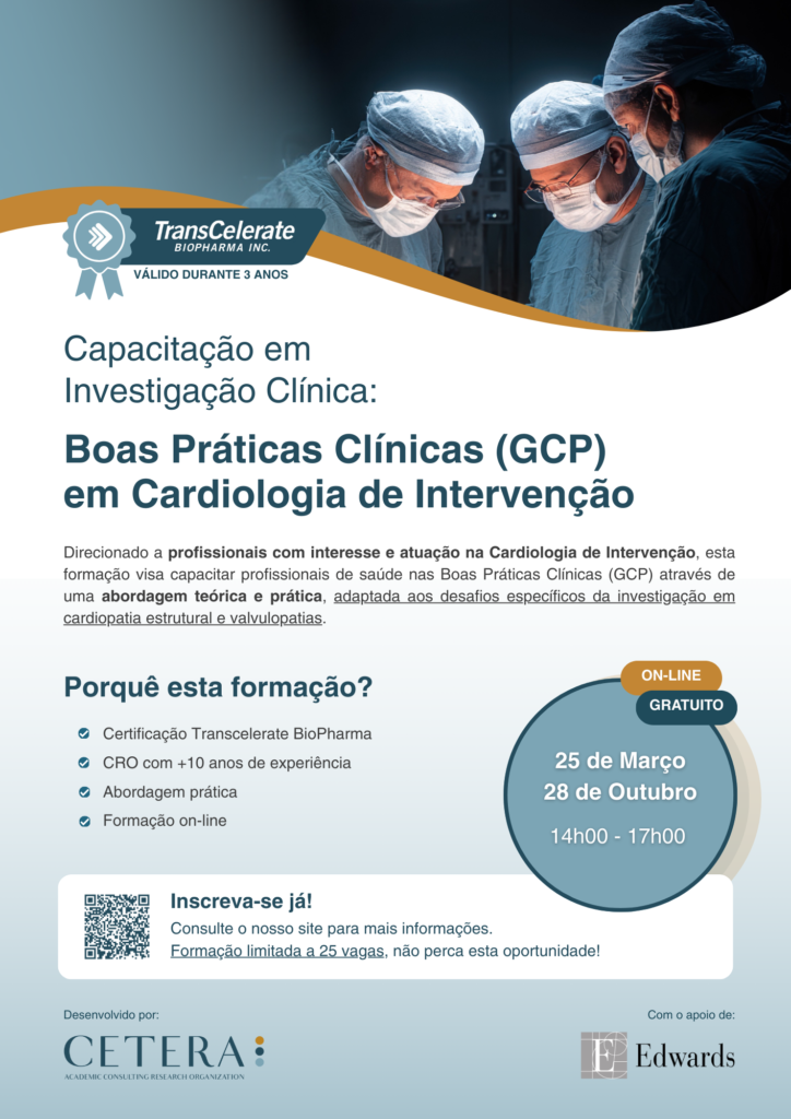 A formação avançada em Boas Práticas Clínicas (GCP) em Cardiologia de Intervenção é desenvolvida pela CETERA, com o apoio da Edwards Lifesciences. Este curso oferece uma abordagem teórica e prática com foco exclusivo nas particularidades da investigação cardiovascular, sendo destinado a médicos, enfermeiros, técnicos de cardiopneumologia e profissionais da indústria que atuem no contexto da Cardiologia de Intervenção.